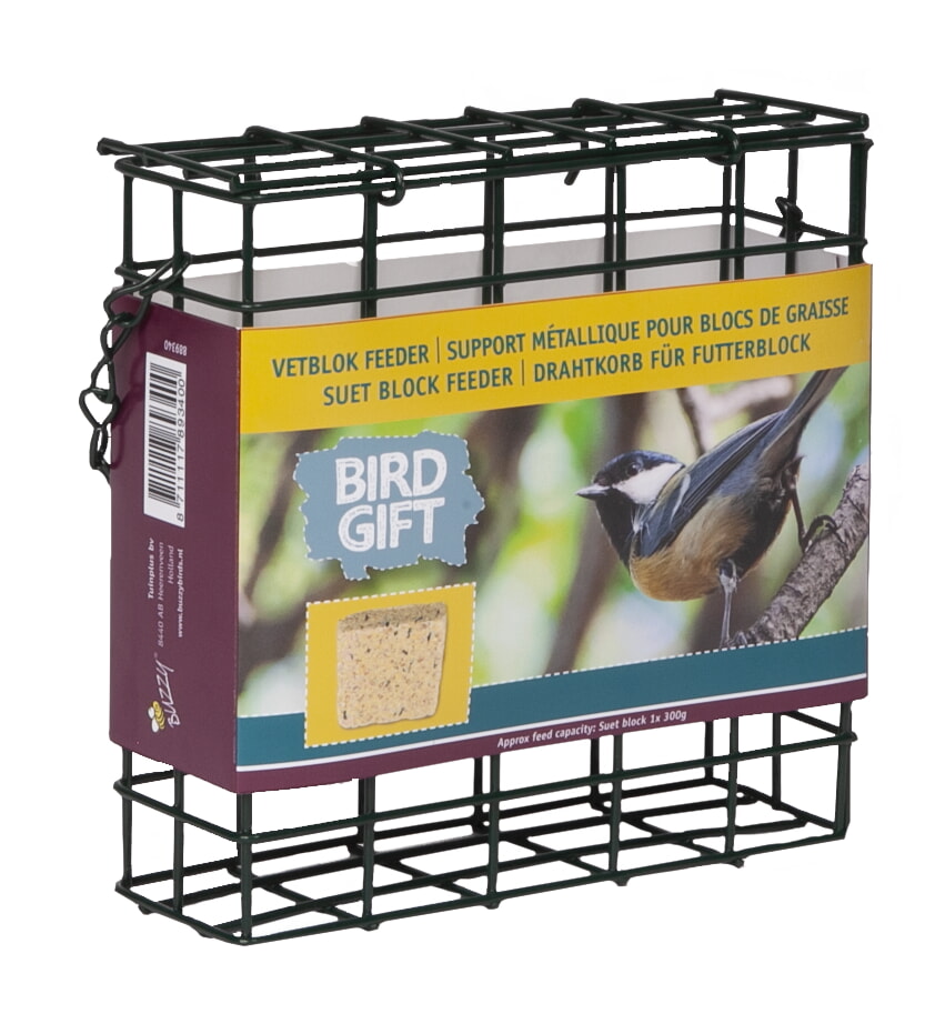 Duurzame geplastificeerde metalen feeder, geschikt voor vetblokken voor vogels. Geschikt voor 1 vetblok. Hoogte 12 cm.