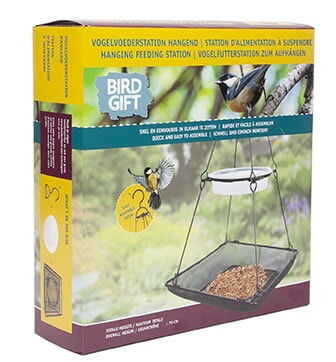 De grote voederbak en het clip-in vogelbadje hangt u met de haak gemakkelijk aan een tak.