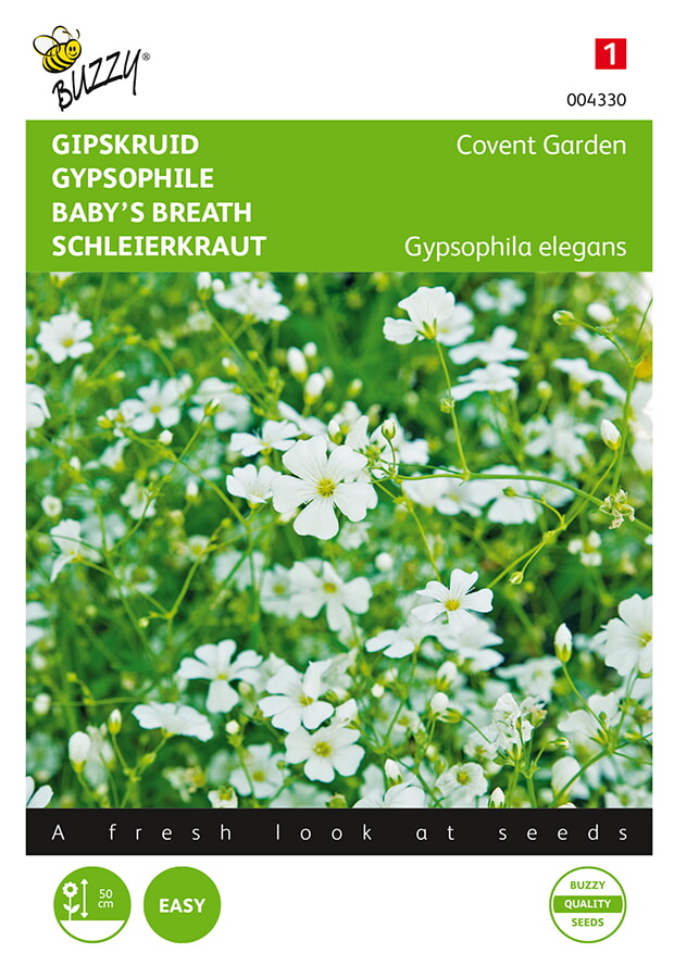 Wie ooit heeft gezien hoe mooi sneeuwwit Gipskruid tussen andere planten staat, wil ook zo combineren. Deze eenjarige planten vormen hele wolken, grote, witte bloemen. Ook prachtig in boeketten te gebruiken en geschikt als droogbloem. Het blad is apart zeegroen. Hoogte: 50 cm.Zaaien: Vanaf eind maart tot eind mei buiten zaaien; breedwerpig of in regels en dan iets uitdunnen. Groeit goed tegen muren op als decoratie.Bloeien: juni- september