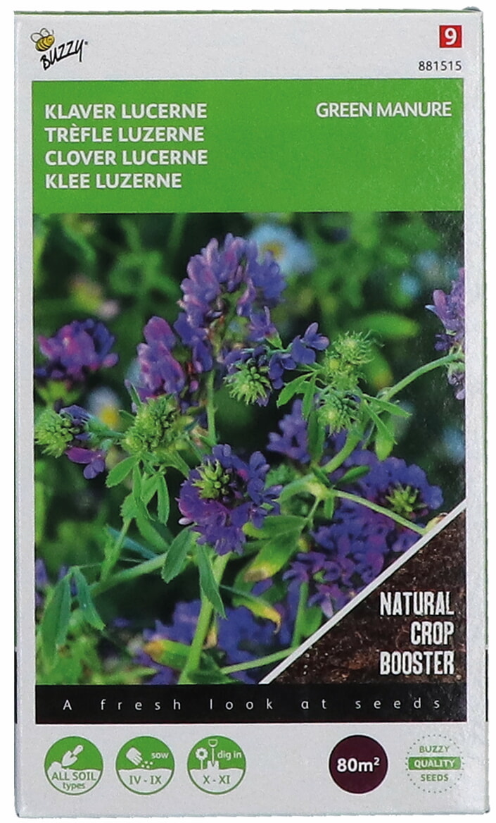 Luzerne klaver is een zeer goede groenbemester. Het is een vlinderbloemige en kan stikstof vastleggen vanuit de lucht naar de grond. Door het omspitten van de luzerneplanten wordt het gehalte organische stof ook nog eens in de grond verhoogd. Deze groenbemester voorkomt ook dat onkruid zich vestigt op het vrijgekomen stuk grond. Luzerne klaver bloeit met mooie paarse bloemen waar insecten graag op af komen. Inhoud: 200g is geschikt voor 80 m²Waarom Klaver Lucerne• Voorkomt het vestigen van onkruid• Zeer geschikt voor insecten