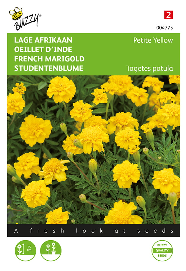 Petite-rassen groeien heel compact en blijven laag (25cm). Deze bloeit helder geel, met mooi gevulde (dubbele) bloemen. Uistekend voor perken, borders, randen en bloembakken. Regelmatig verwijderen van uitgebloeide bloemen verlengt de bloeitijd. Zaaien:Half maart tot half april onder glas of half april tot eind mei buiten op een zaaibed; 5-6 weken na de uitzaai uitplanten.