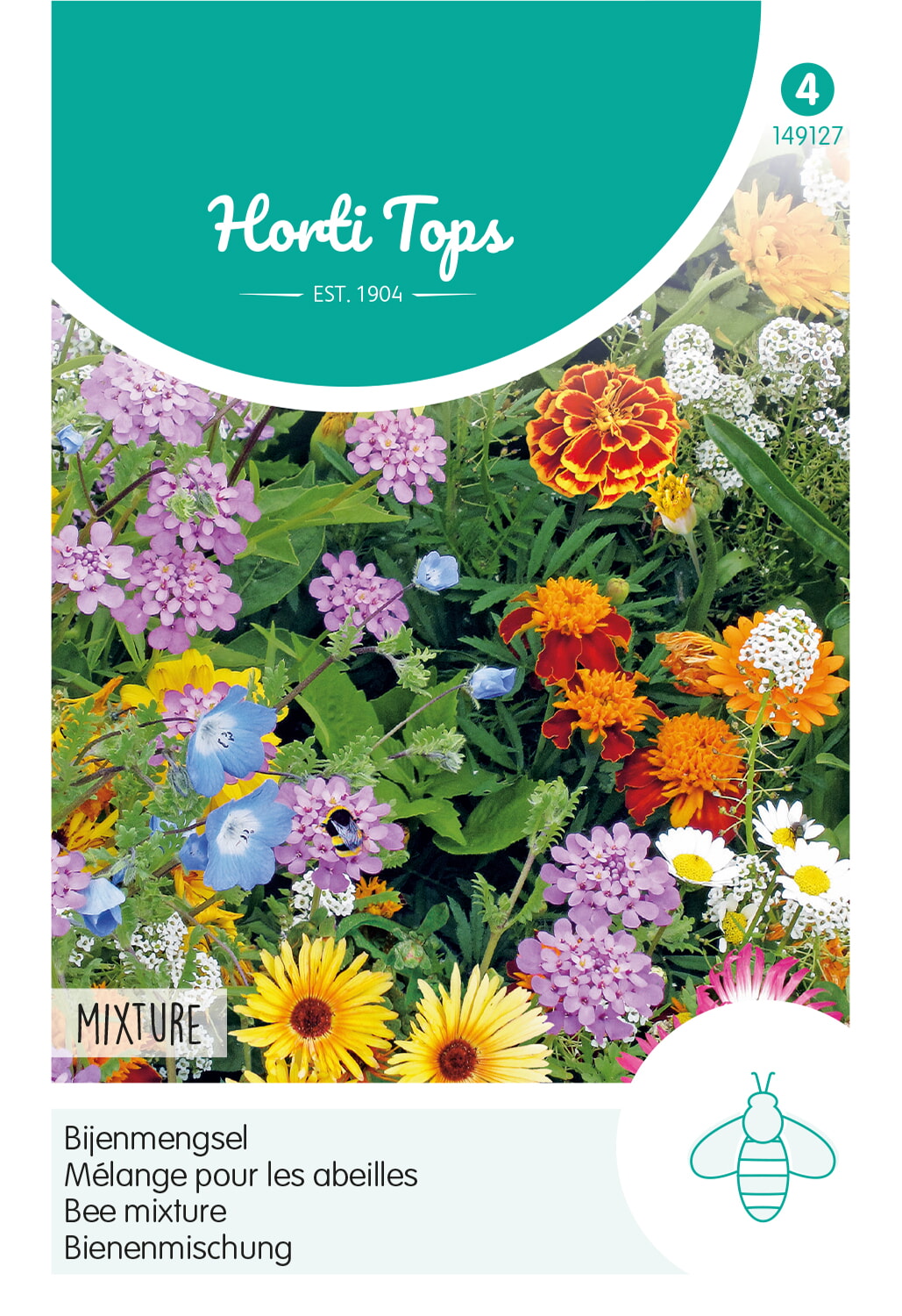 Bijenmengsel - LaagMaart-eind juni breedwerpig en direct in de vollegrond zaaien. Gebruikongeveer 2/3 gram per m². Een mooi laagblijvend mengsel dat speciaalis samengesteld om bijen aan te trekken.Hortitops Special Edition